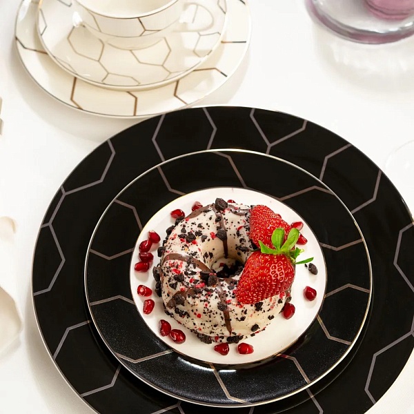 Изящная серия Mari выполнена из тонкостенного фарфора в стиле ар-деко. Коллекция посуды создана в разных цветовых вариациях и рисунках со специальной техникой нанесения подглазурной деколи. Такая техника гарантирует, что рисунок со временем не померкнет. Специальный метод нанесения золотого канта позволяет использовать посуду в СВЧ и морозильной камере.